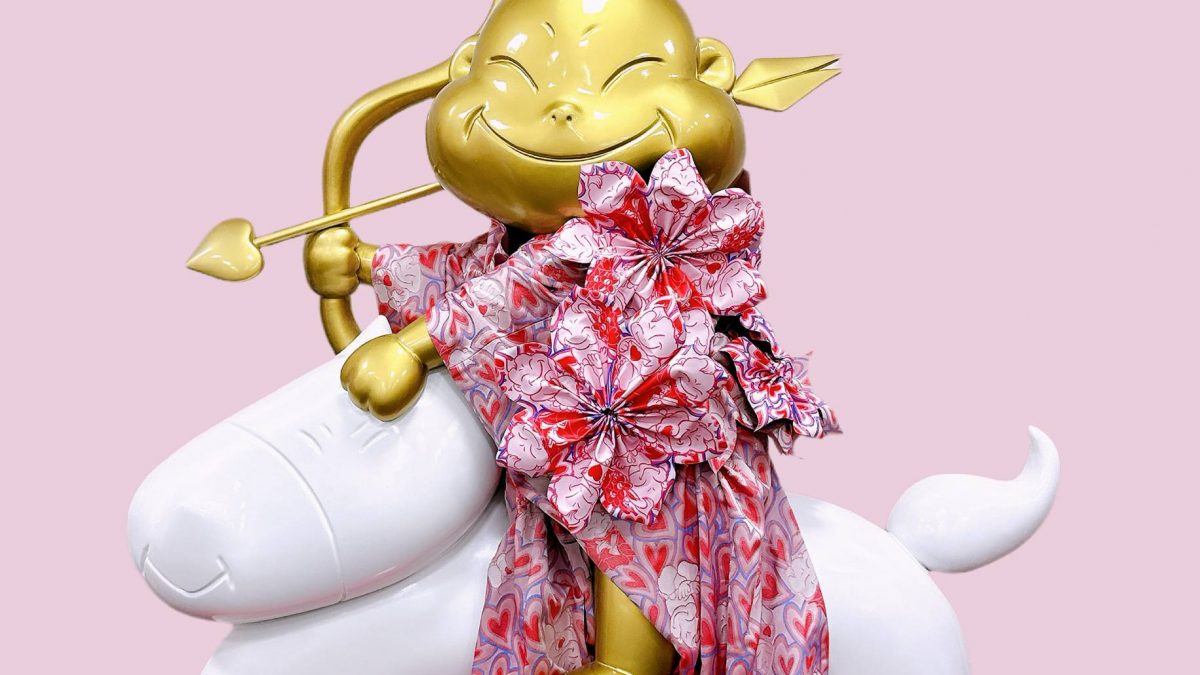 繊維産業の街「大阪・船場」ともつながりのあるビリケンさんを大阪文化服装学院の学生がキューピッドにデザインしました。幸せも経済成長も手に入れられるよう、今日もたくさんの出会いを見守ります。