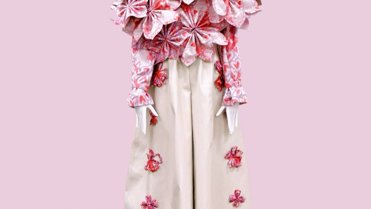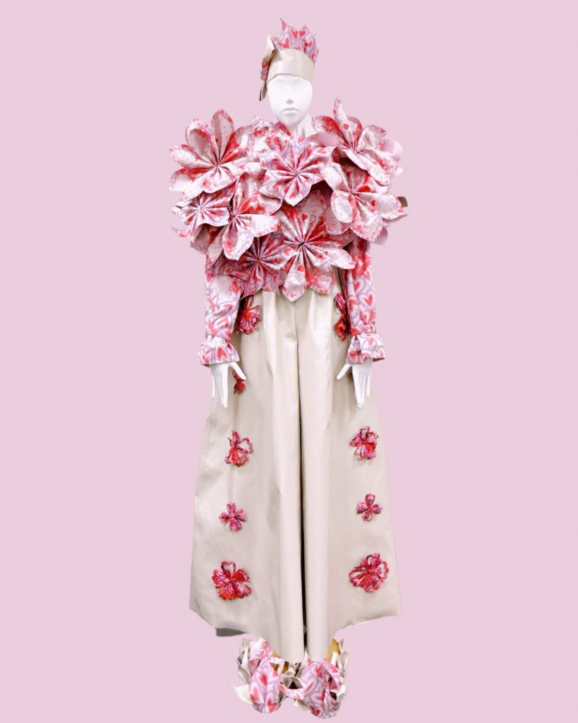 服の表の花には、このお米の合成皮革に、大阪文化服装学院の学生がデザインした柄を北高株式会社がプリント加工しています。プリント加工は水を使用せず、皮革とプリント加工の出会いから地球にやさしいファッションが生まれています。