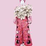 This synthetic leather is made from inedible rice which was made in Fukushima Prefecture, where the rice fields have ceased cultivation due to the wake of the Great East Japan Earthquake. The flowers on the dress are made by the synthetic leather, and the printed patterns are designed by young students. The print processing is waterless, which prevents water pollution. By harmonizing synthetic leather and print processing, you can also enjoy eco-friendly fashion.