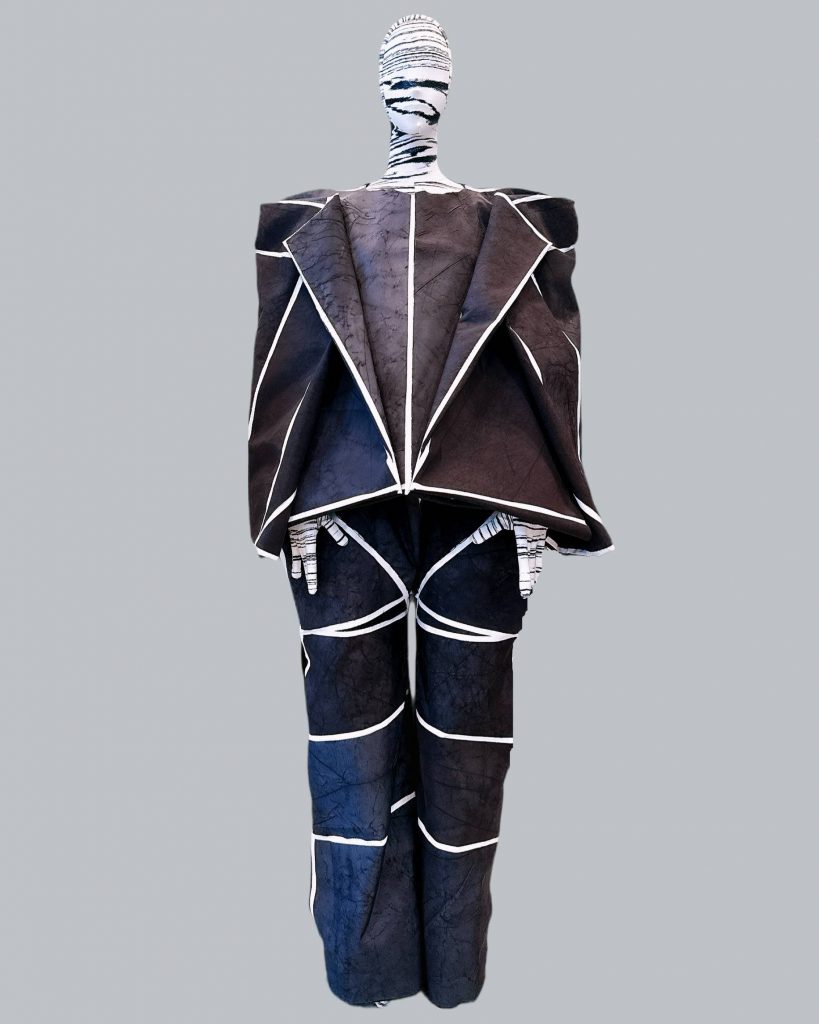 Deep black-dyed suits. This traditional craftsmanship is called ‘Kyo-kuromontsuki zome’ which is very rare nowadays. The suit uses airbag materials from cars. This dyeing method requires skilled technique. By enjoying the different look before and after dyeing, you can enjoy wearing them for a long time. As the displays are designed by young students, Japan’s tradition of making quality products and techniques will be passed on to the next generation.
