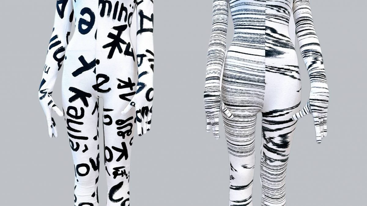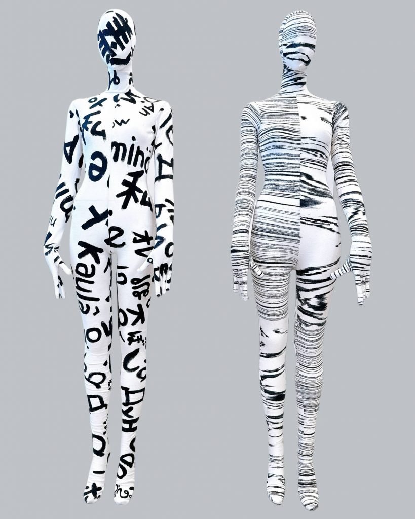 Soft bodysuit that can be enjoyed with irregular patterns. This is complexly made by students who first drew patterns on a knitted cloth, then unraveled it back to thread, and re-knitted it into a new pattern. By re-knitting, it was re-born into an unpredictable and interesting designed cloth. The cloth is organic and has passed strict regulations and is friendly to the environment and human beings. The innovative ideas and efforts by the students brings about newness and depth to the fabric.