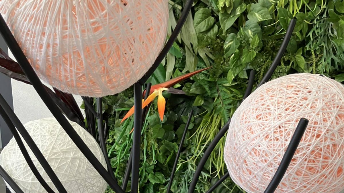 音と映像に合わせて“香り”も感じる未来の暮らし。目印のある場所に立つと、糸などで作られた「果実」を模した造形物から映像に合わせた香りを体験できます。